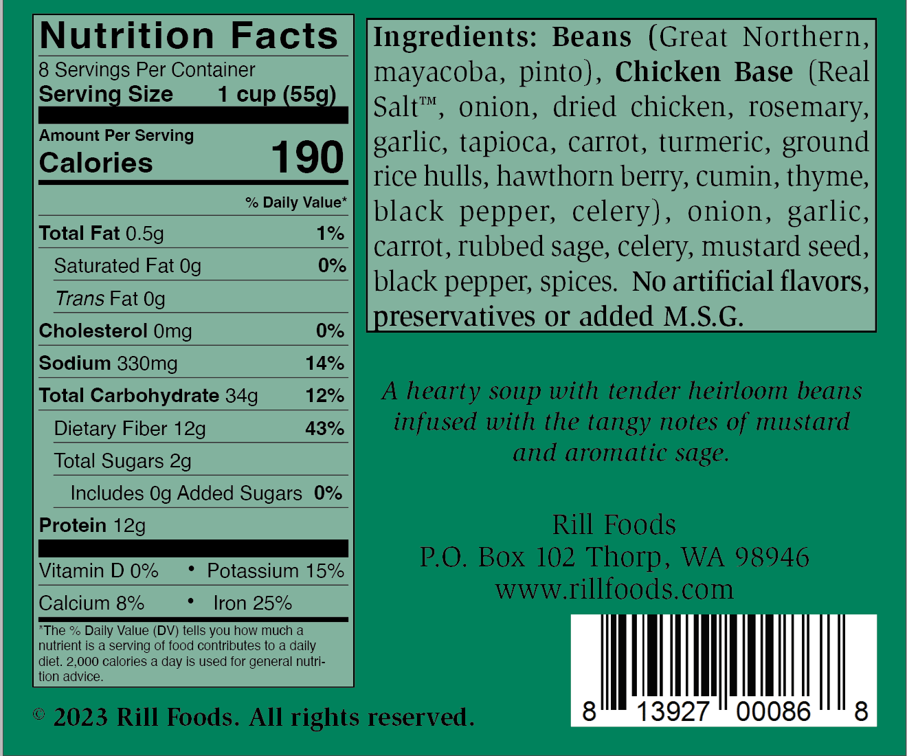 A hearty three bean soup with tender heirloom beans infused with the tangy notes of mustard and aromatic sage.